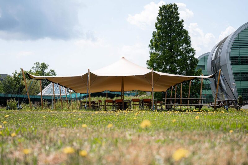 Cette tente stretch de 10 x 20 mètres offre un vaste abri de 200 m², idéal pour les grands événements, les terrasses de restaurants ou comme couverture élégante pour une université.