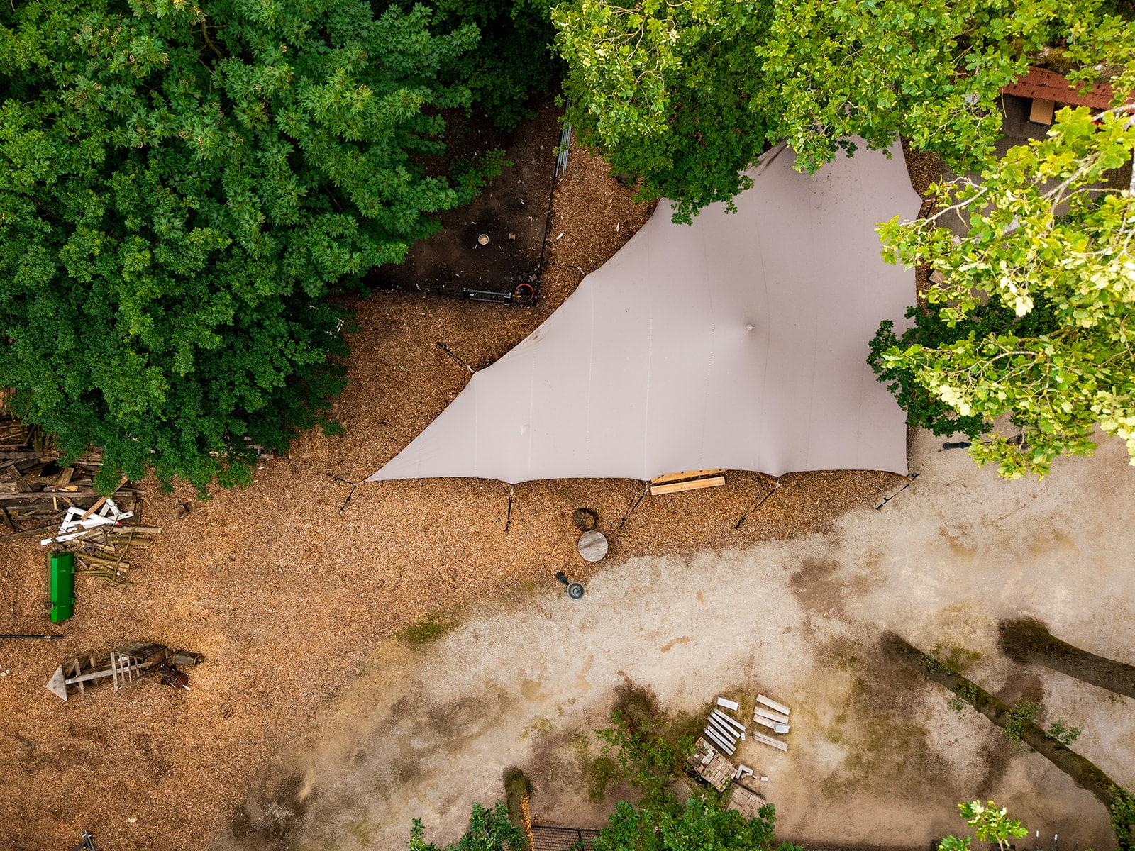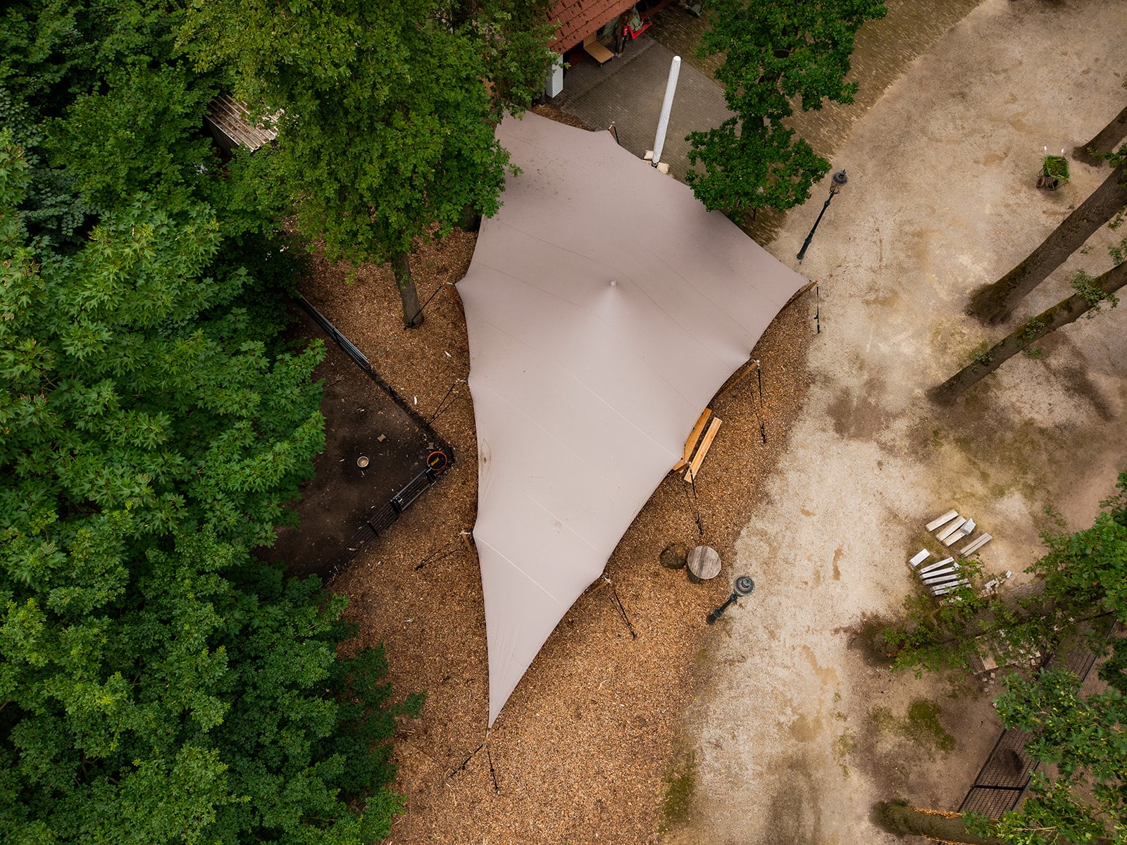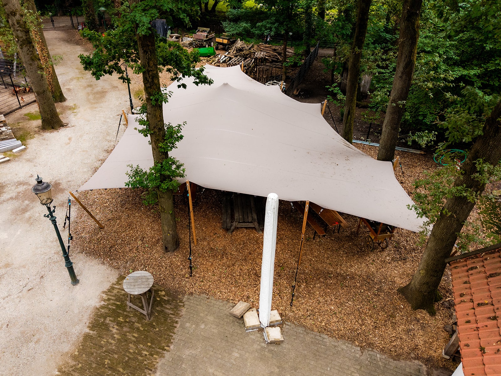 Luchtfoto van taupekleurige special shape stretchtent tussen bomen bij Stadsboerderij De Wesseler