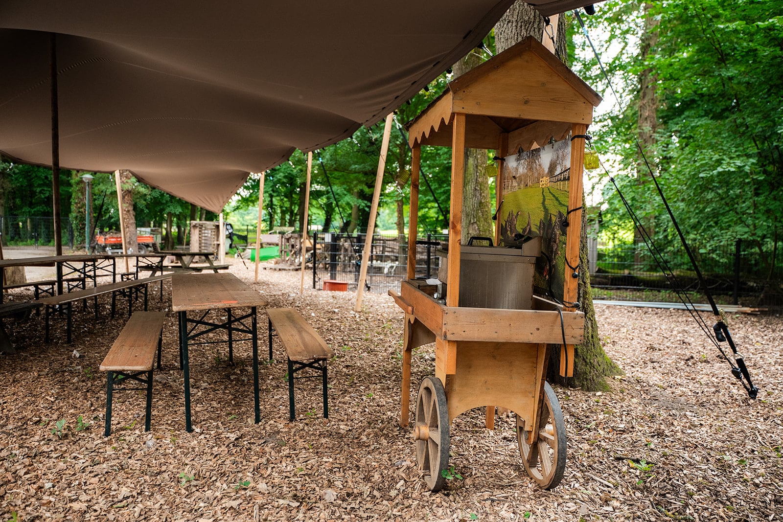 Stretchtent bij Stadsboerderij De Wesseler met tafels en houten kar