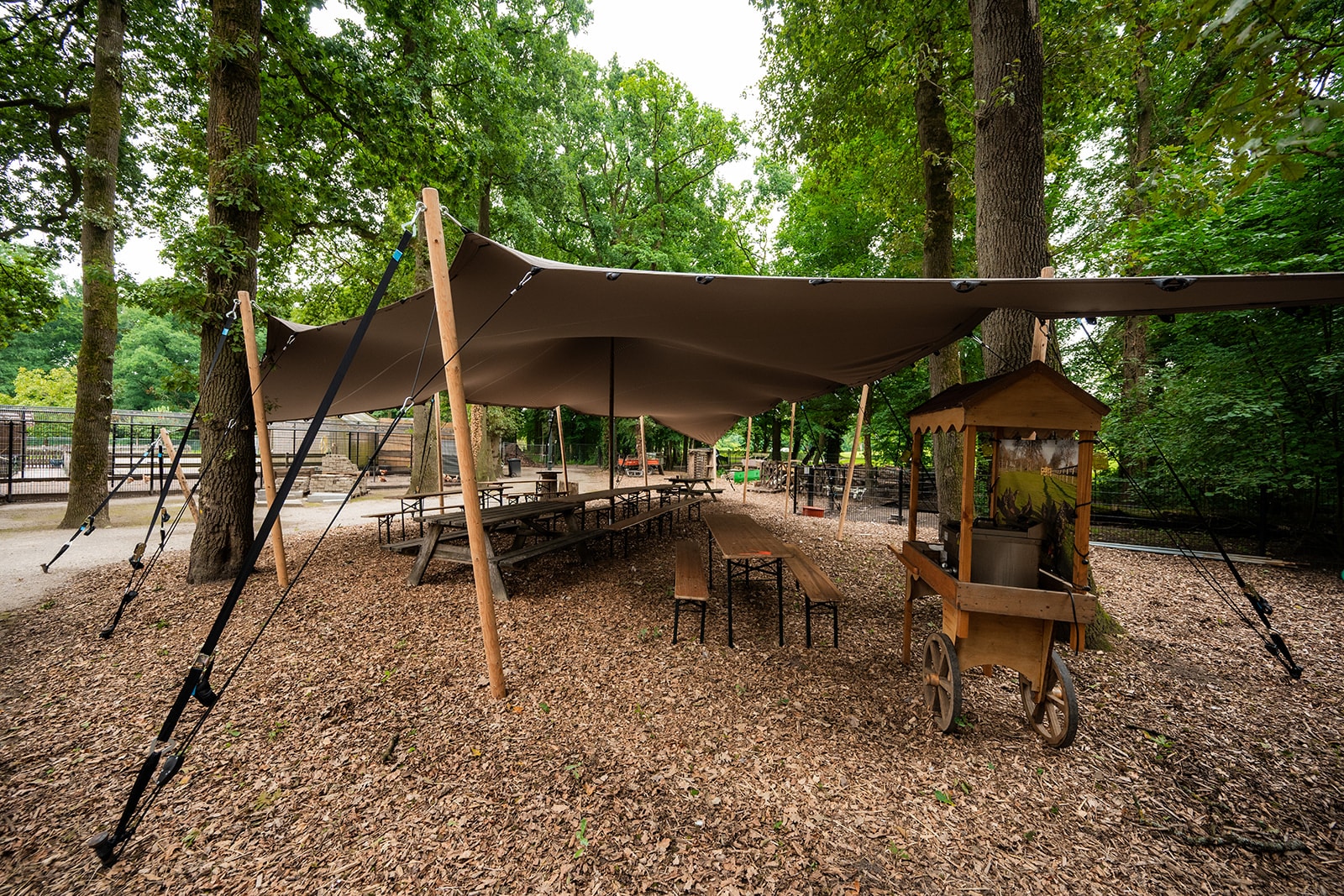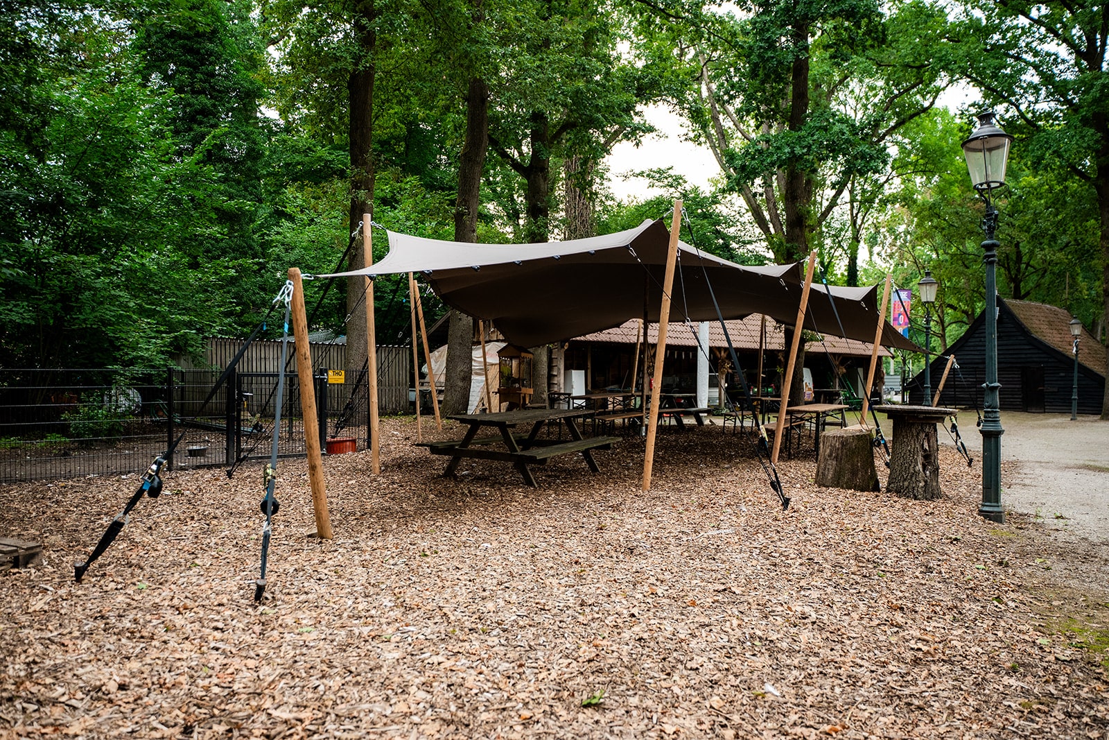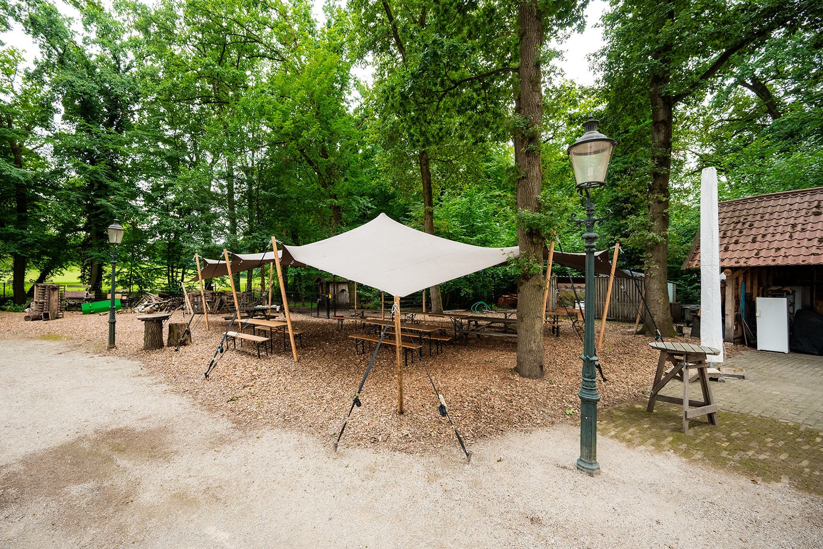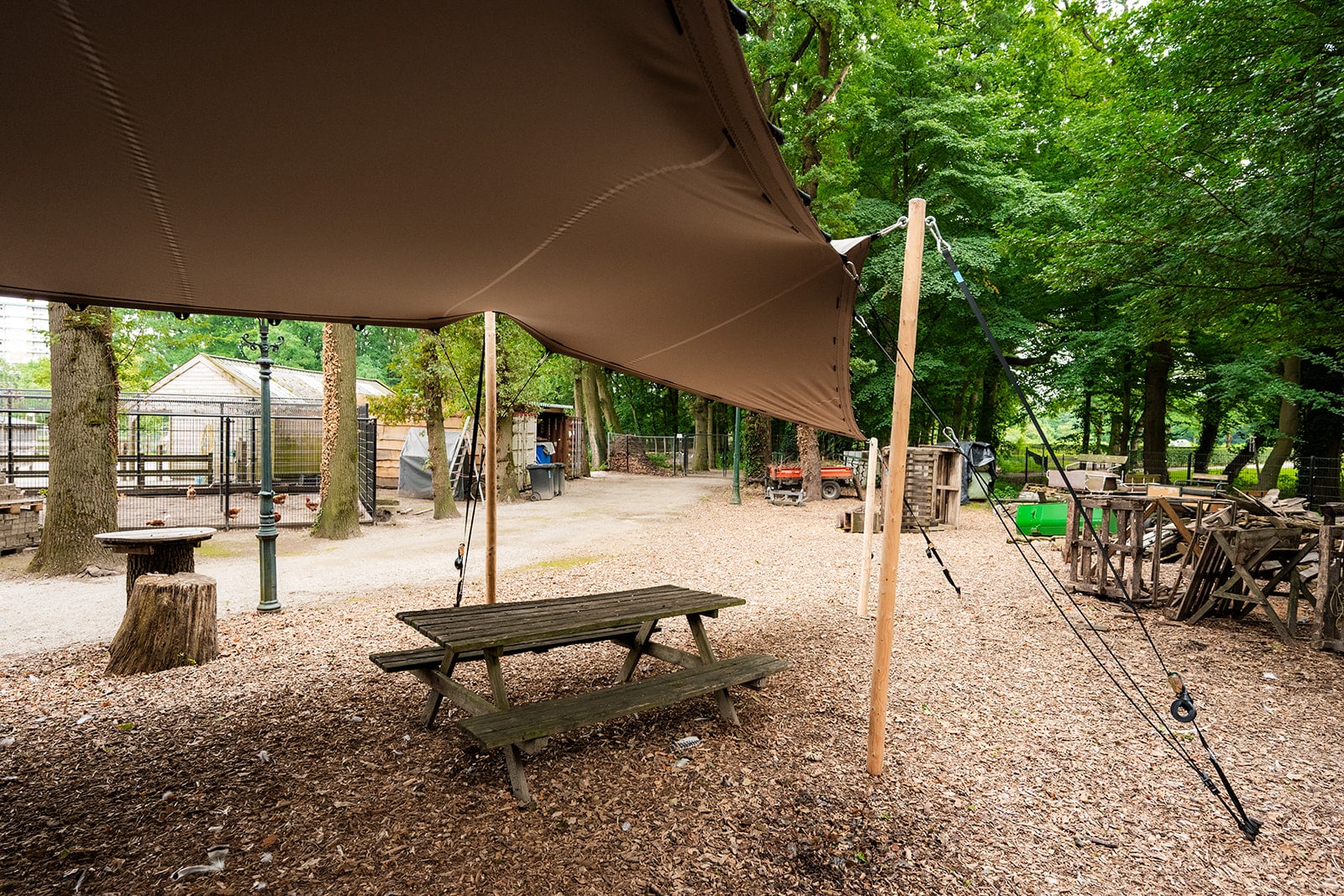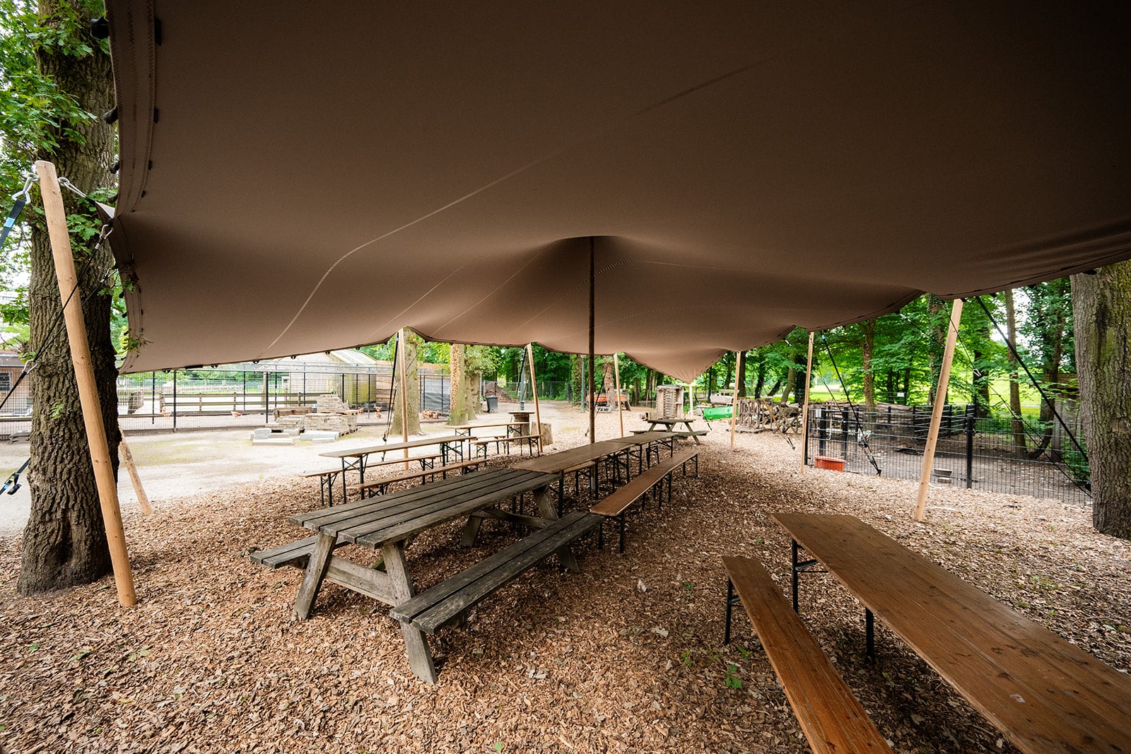 Stretchtent met houten palen en open zijkanten bij Stadsboerderij De Wesseler