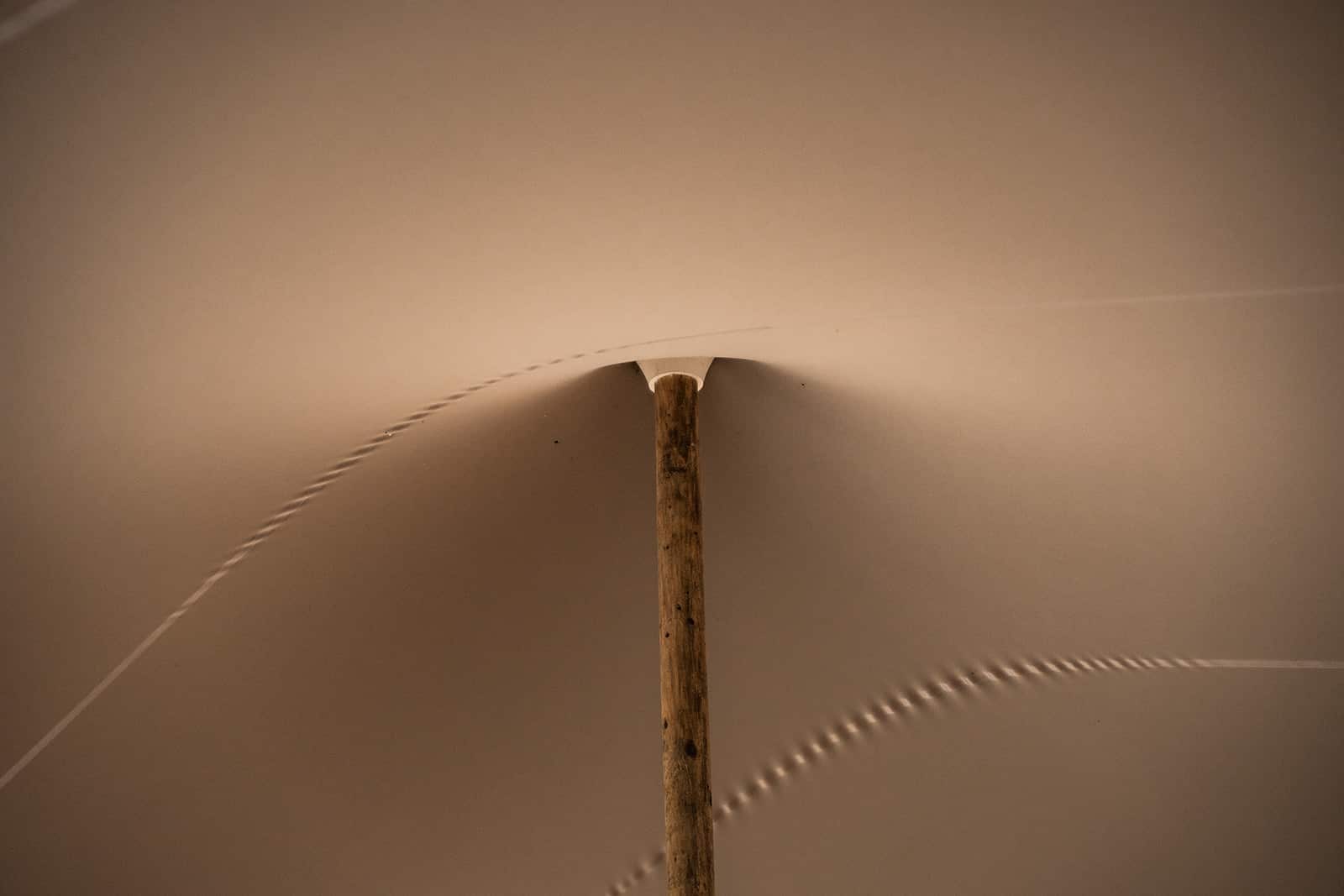 Zijkant van de stretchtent bij Stadsboerderij De Wesseler met houten palen